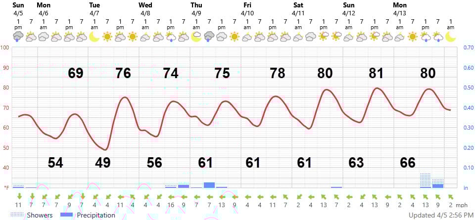 So….Tuesday Apr 15 & Wednesday April 15 will be warm with highs in the low 80s followed by showers and storms late Wednesday or Thursday. Thursday and Fridays lows in the 50s, highs low-mid 70s followed by 80s for that weekend.