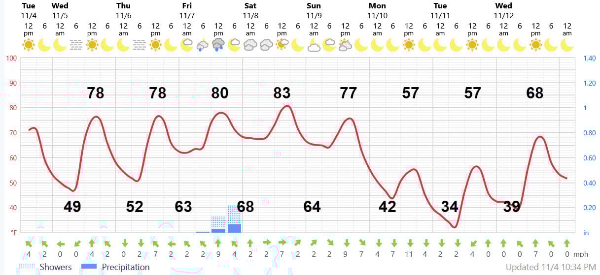 If the trick or treat monsters didn’t smush yours, you should see frost on your pumpkin next Tuesday morning. Widespread low- to mid-30s should prevail from Hammond to Gulfport. But don’t expect cool weather until then. A quick look at Foreca’s weather-at-a-glance graphic shows the roller coaster ride I mentioned in Sunday’s letter. Right now, we’re climbing the hill and will be until Saturday evening when highs should hit the mid-80s!. Then, the front comes through on Sunday , the winds pick up Sunday night and the bottom drops out. Whee…..