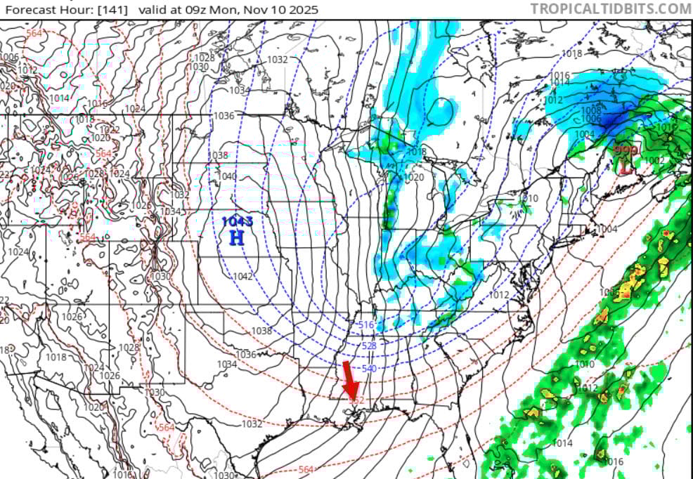 For a somewhat more scientific explanation, another big dip in the jet will develop over the Central and Eastern U.S. beginning this weekend. This will cause a surface low pressure system to develop near Chicago and track east to Maine dragging a strong cold front through. Monday morning’s ECMWF (European) model forecast shows that Low near Maine, a cold front extending into Florida, and a strong Canadian High over Nebraska heading our way. The red arrow shows the strong northerly winds we’ll be experiencing. Those winds will blow the cold air in, but keep us from having frost Monday morning. But as the winds die off Monday night, the frost will settle in. By the way — the blue you see here and there in Tennessee represents snow flurries is possible over the higher terrain there.