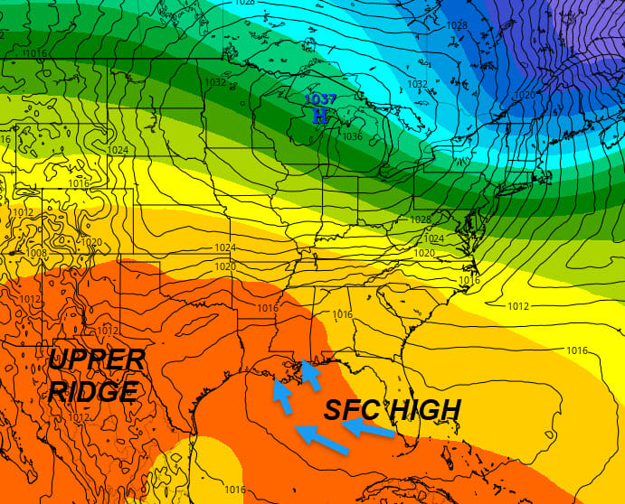 After tonight, well there’s just about nothing to talk about. The ECMWF forecast for Monday morning shows a subtropical, surface high pressure area over Florida giving us a light and somewhat humid breeze (blue arrows). Aloft, there’s an upper level high that will be building east from Mexico during the week (red colored contours). Together, it’s spelled “Chamber of Commerce” weather with sunny skies and a dry week. In fact, I think there will be no more rain for the month of March. Some of you will be happy, but some of us gardeners will be hauling out the hoses.