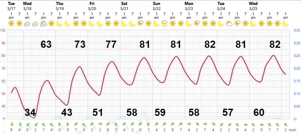 Expect the next week beyond this graphic to be somewhat more humid with highs in the low 80s and lows in the low 60s. There may be a few more clouds in the morning hours. However, I don’t see any rain until April 2 at the earliest. My long-range guru still thinks there will be one more last hurrah of winter up north sometime in early April - but in April, even if the cold air makes it down here we’re talking 40 degree weather.