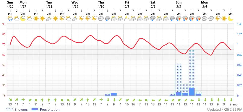 Again, the Foreca graphic underestimates the high temperatures. However, it does show the cooling trend nicely. Wednesday night’s showers/storms could come in several rounds and I wouldn’t be surprised to see more rainfall than the few tenths of an inch shown since the air will be so hot and humid. Rainfall chances are low for late Thursday and Friday but skies will be mostly cloudy. The Gulf storm looks to give us a steady, soaking rain with a few downpours in thunderstorms for Saturday. Then, wouldn’t you know it, net Monday May 4 looks to be a gem with sunny skies, less humidity, Northshore lows near 50 (Southshore, low 60s) and highs only in the mid 70s. Wow.
