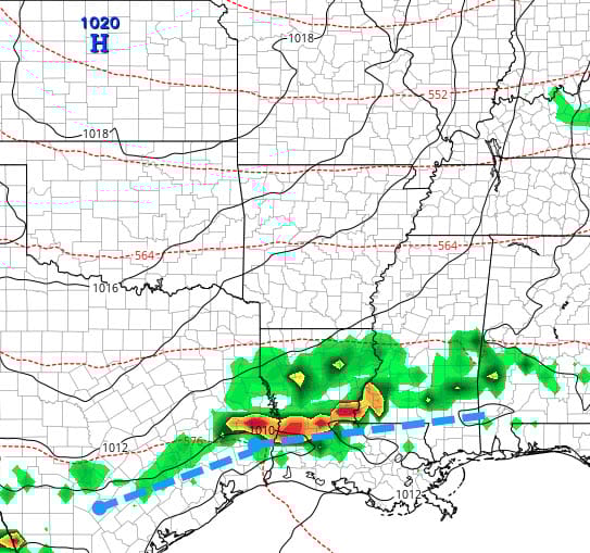 Speaking about down time, the atmosphere will have some tonight through Wednesday morning. (Yes, there are a few showers developing near Poplarville heading in the direction of Gulfport-Biloxi, but they will die off or move offshore in a few hours) As we approach summer, down time typically means sunny, hot, and humid weather. You’ll feel like jumping in the pool tomorrow afternoon; but if you heat it, you’ll only have to do it again later in May because the heat will be broken later this week. This map shows the European forecast for late this Wednesday afternoon. A weak cold front, drawn as a dashed blue line will come through that evening with another line of showers and storms (greens, yellows, and reds).