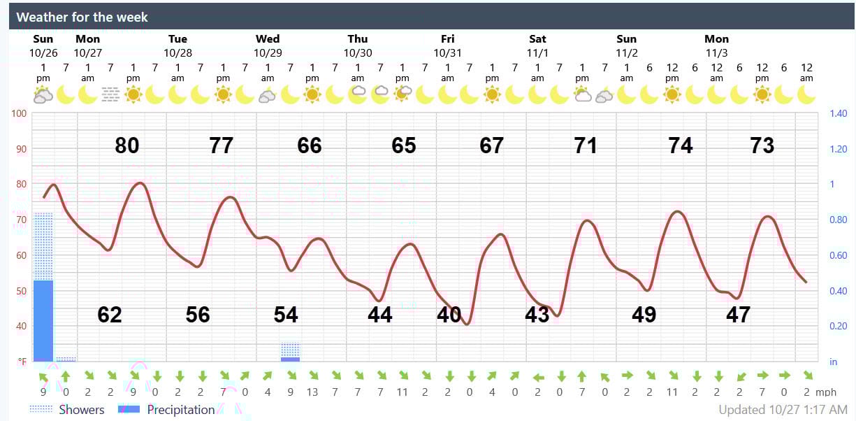 Winds should gust to 25 mph over land and 35 over water on Wednesday and Thursday before dying off on Friday. Trick-or-treat temperatures will range from near 60 close to sunset to near 50 at 9 PM, especially in inland areas. Time for you to get that hot apple cider and fire pit going while the kids get their sugar high. See the next section for more details.