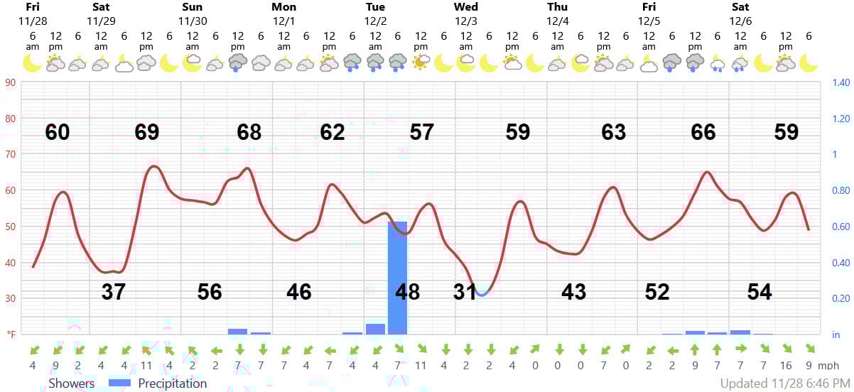 Subtitled “If you don’t like the weather, wait a day” for an active weather pattern. After a cool Black Friday, and a warmer gem of a Saturday, a cold front approaches slowly from the west early Sunday. Follow this sequence of events using the graphic below produced by the National Weather Service.