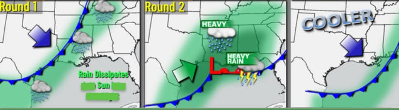 Round 1 for rain chances features a cold front with showers coming into Tangipahoa and Washington parishes perhaps as early as 1 AM on Sunday. But the rain-making mechanisms will be dying off the further east the showers go. By the time the showers reach Slidell in the wee hours of Sunday morning, they could be breaking up and might die out completely by the time they reach Biloxi by mid-day Sunday. The cold front does make it offshore where it stalls.