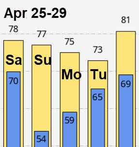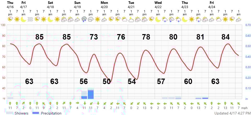 Unless you are trying to heat your swimming pool, the spell of cool weather with lower humidity will be delightful. Monday morning’s low of 50 could easily be 48 in some rural inland locations. We won’t see temperatures that chilly again until October. Notice that the Thursday rain has been delayed into the long-range. Humidity will increase by Friday April 24.