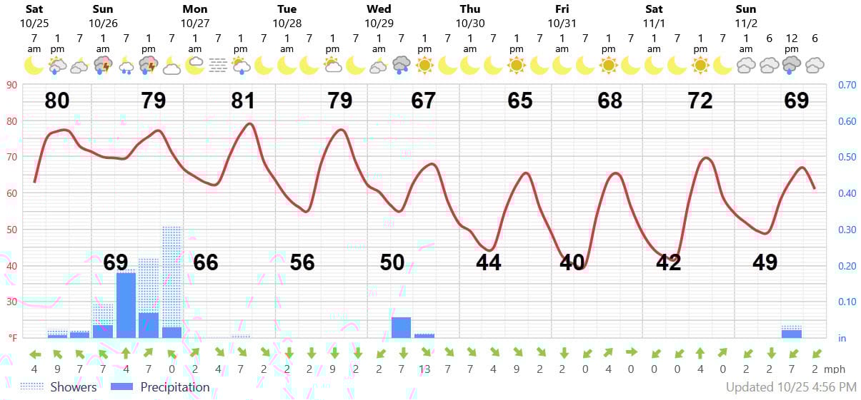 Third, the big cold front for next week is still on schedule, but temperatures will be colder than I forecast. Lows will be in the low to mid 40s Thursday and Friday on the Northshore ( low 50s Southshore) with highs in the mid- to upper-60s. See the at-a-glance graph below and discussion for more details. So….it’s time to dig out those sweaters and jackets.