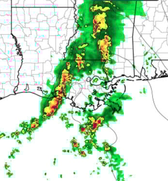 First, showers will be moving in this afternoon. Heavy thunderstorms are already in the Lafayette area, and my favorite small scale forecast model (HRRR), shown below at 4 PM) depictss them reaching our area in a weakened state. The timing: About 2 PM in Hammond, a few hours later in Slidell. The good news for the LSU game is that the rain will be ending in Baton Rouge at about 3 PM and the next line won’t arrive until after midnight