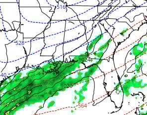 Cold air will be moving in Saturday behind yet another cold front and this map shows the European model forecast for midnight Sunday morning. Showers have broken out behind the front (the green area) which covers the Southshore and barely reaches into Southern St. Tammany Parish and the immediate MS Gulf Coast. A dashed blue line labeled “40” (really 540) cuts from the north side of Picayune to Ponchatoula, barely missing the precipitating area.