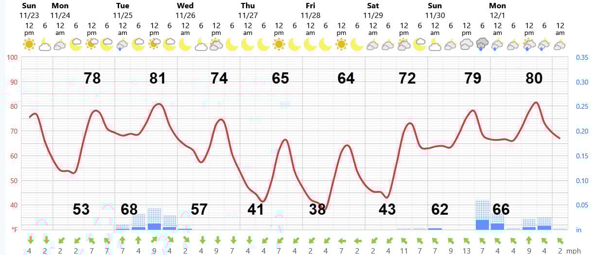 Tuesday Dec. 2 should be another warm and humid one with highs in the mid 70s to near 80 and lows in the mid 60s. Another chance of showers or storms on Wed. Dec. 3 followed by a bit cooler weather. Week should end with highs in the upper 60s to low 70s and lows in the upper 40s to low 50s. No frost (other than the one mentioned for Friday in a few rural areas) or freeze in sight.