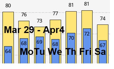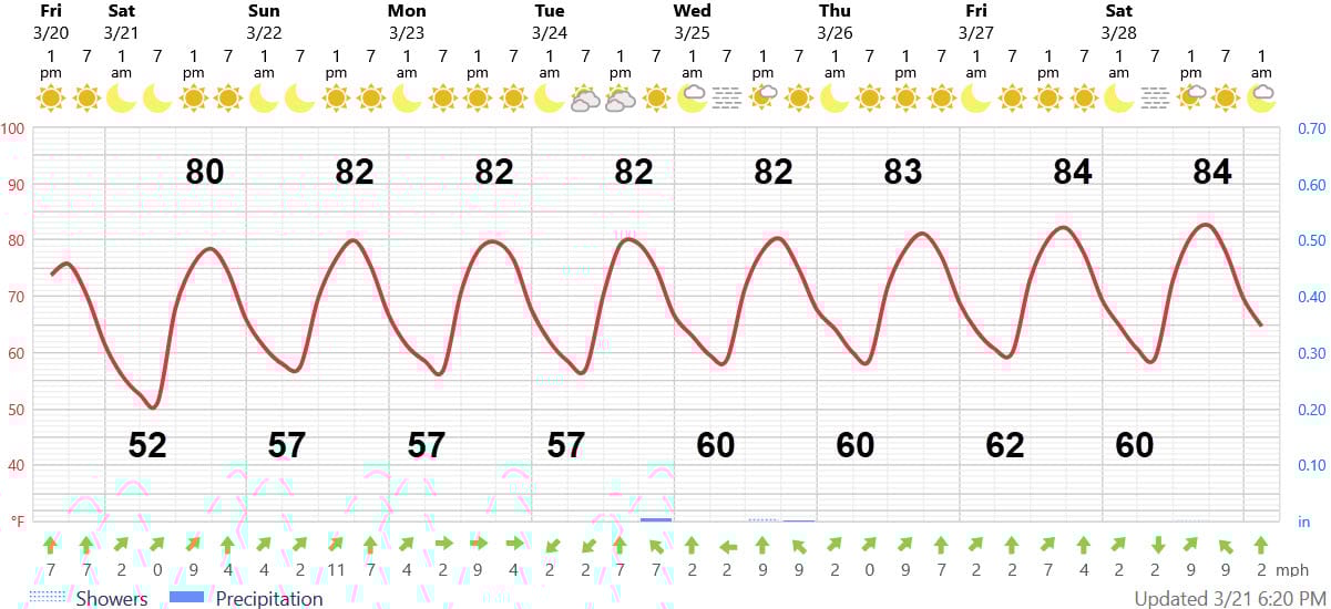 The Foreca graphic looks a few degrees cool in spots, but otherwise there’s only a few comments to make. The high temperatures change little beginning on Sunday, but the lows increase reflecting a bit more humidity. With that humidity, we could see patchy fog starting on Wednesday.. Otherwise — plenty of sun and no chance of any significant rain all week. The only exception: Some models are showing some piddly showers in inland areas on Wednesday.