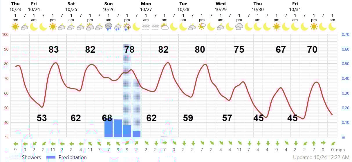 Friday: Sunny. Lows the same as Thursday. Wind dies down. Highs about 70. Temperature for trick-or-treat time near 60 falling into the 50s. Nice!