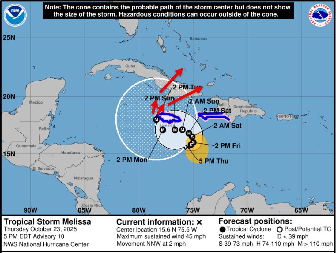 The Euopran AI model (actually developed by Google and called “Deep Mind”) has snapped back eastward to join the ECMWF forecast, which the National Hurricane Center now agrees with. See the forecast below. This slowly curves Melissa south of Jamaica before taking it over or near the west end of the island. Beyond this, Melissa should move over Eastern Cuba and parts of the SE Bahamas. My red arrows show two possible paths. Neither are near Florida. Jamaica and Eastern Cuba will probably receive catastrophic damage.